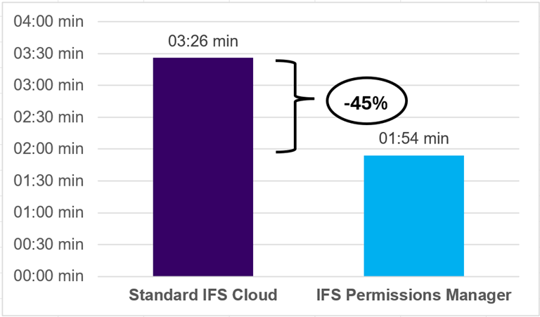 Bild 1: Der Vergleich zeigt, dass die gleichen Aktivitäten im IFS Permissions Manager bis zu 45 % schneller durchgeführt werden können als in Standard IFS.